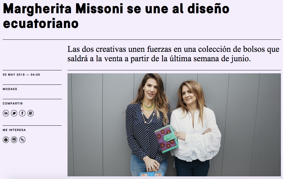 Missoni y Kavalekas hablan el mismo lenguaje. Margherita Missoni y la diseñadora ecuatoriana Ximena Kavalekas se han aliado para el diseño de una edición limitada de bolsos que saldrá a la venta a partir de la última semana de junio y se presentará el próximo 4 de julio, coincidiendo con la semana de la moda de París.