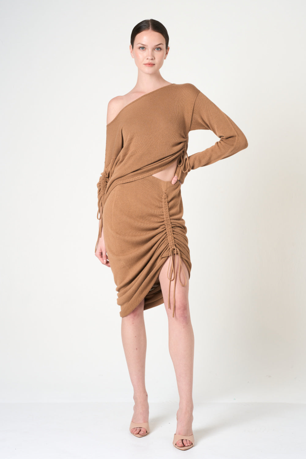 An essential piece defined by clever functionality and an exceptionally smooth feel. Knit with sustainable organic fibers, this top offers a refined silhouette. Customize your look with a dual-style neckline (boat neck or off-the-shoulder), an adjustable sleeve cord for a lifted effect, and a side cord to transform it into a chic asymmetrical crop. This piece effortlessly adapts to your mood and occasion.
