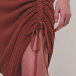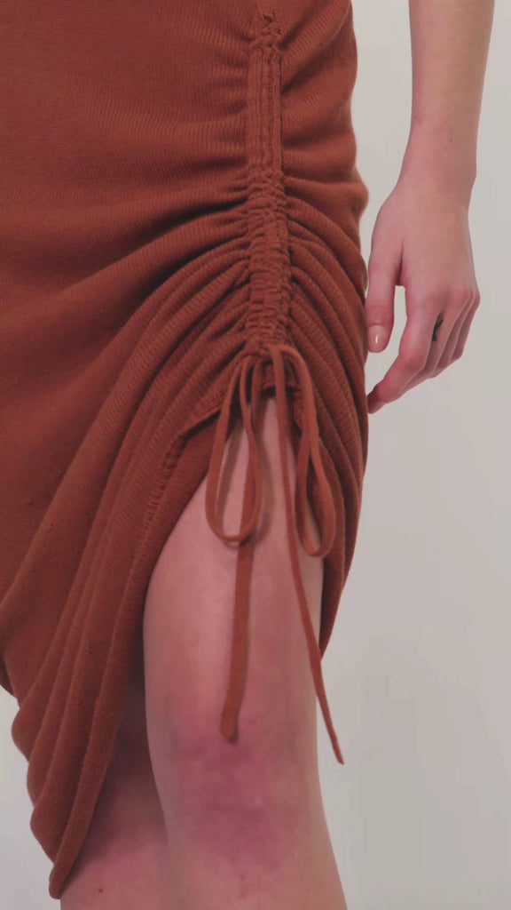 Note: This skirt has a relaxed fit due to the nature of the knit and its adjustable cord detail. It runs slightly roomy by design, offering a flattering drape—but can easily be cinched to your shape for a more defined silhouette.