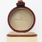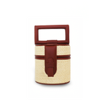 The Tati mini bag is handcrafted in Italy. This style is entirely made of raffia and and tan leather. It has a round-boxy suede-lined interior with a define structure. Carry it by the square handle.