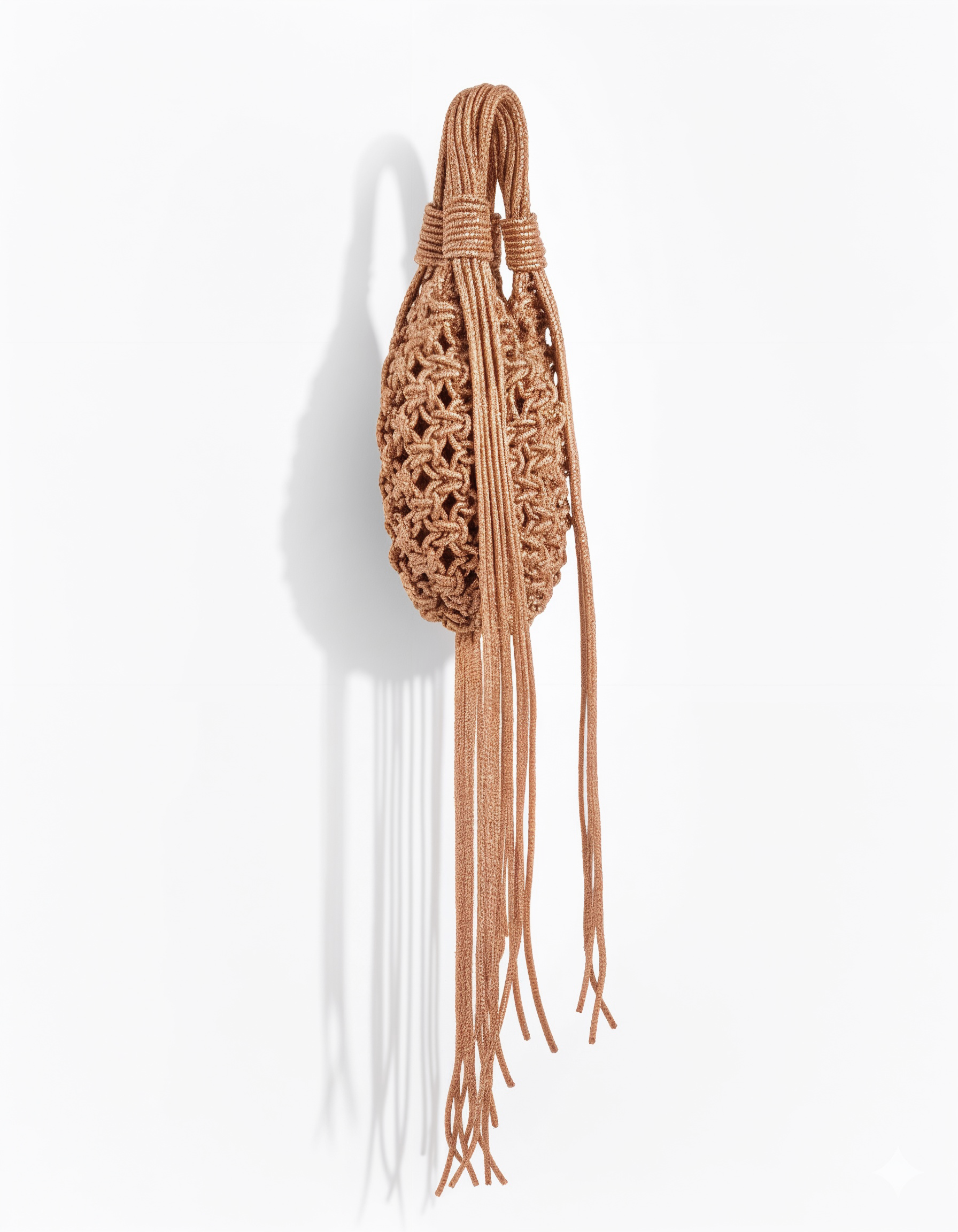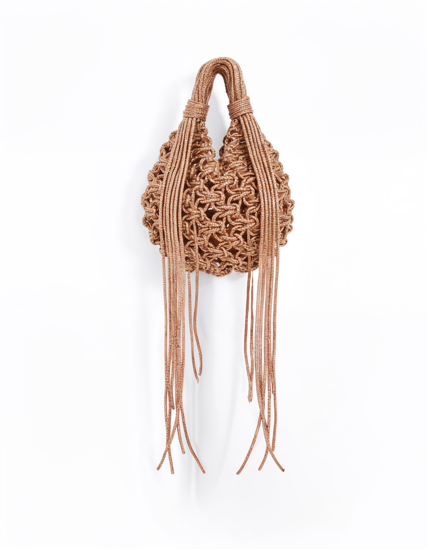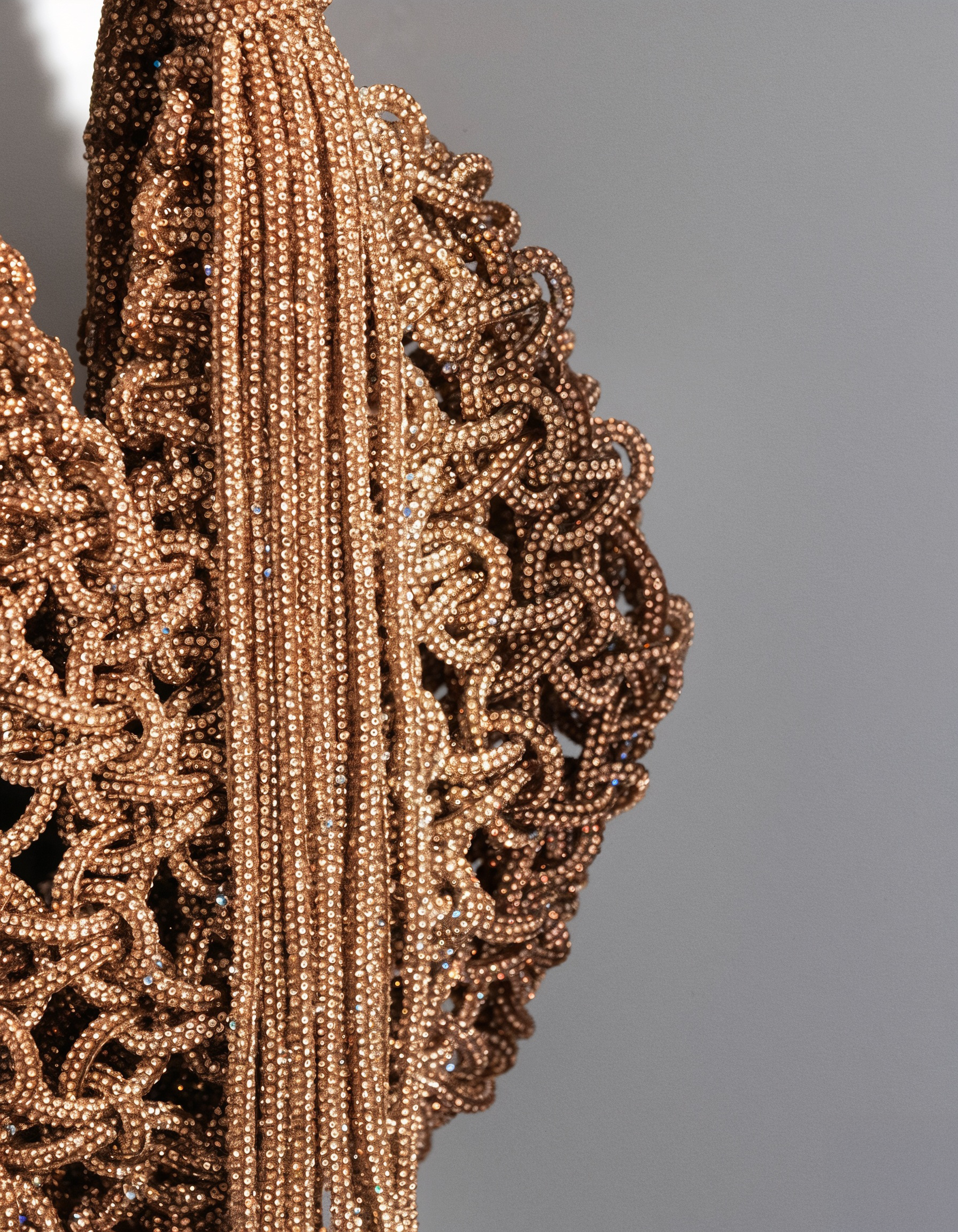 The Chandelier Bag in Cooper is wearable art, handmade in Italy. A sculptural crystal-woven shape with cascading tassels that move with you.