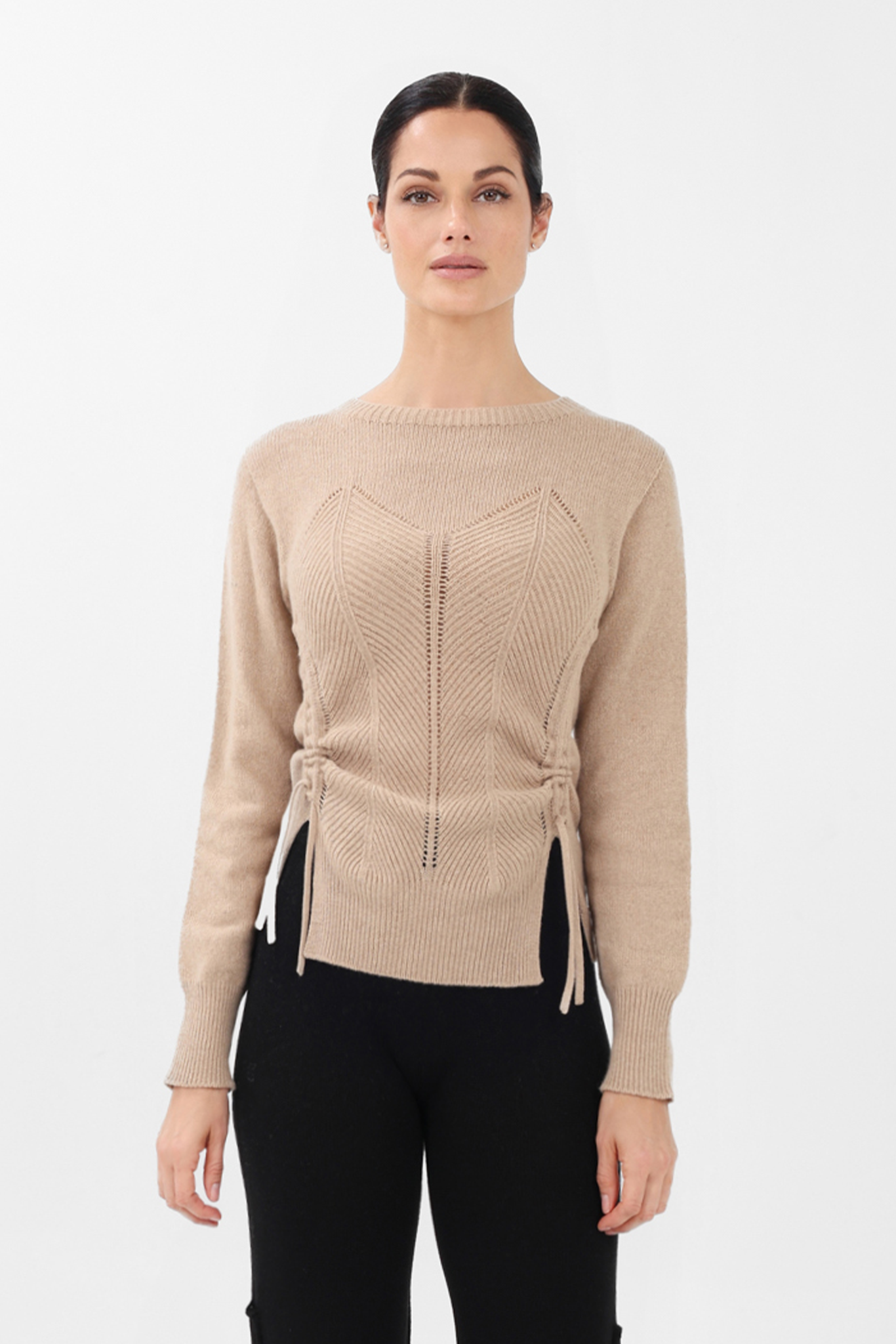 Crafted in the South of Italy, this extra-soft cashmere sweater introduces a modern take with an intricately executed corset detail seamlessly knitted into the front. The co-designed utility is realized through two subtle front cords: wear them loosely for a classic fit, or cinch them to instantly create a personalized, ruched, cropped silhouette.