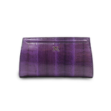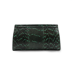 The Ivy clutch in water snake leather showcases a framed top with a discreet magnetic closure, ensuring your belongings remain secure. The detachable chain shoulder strap, measuring 14", offers versatile carrying options.