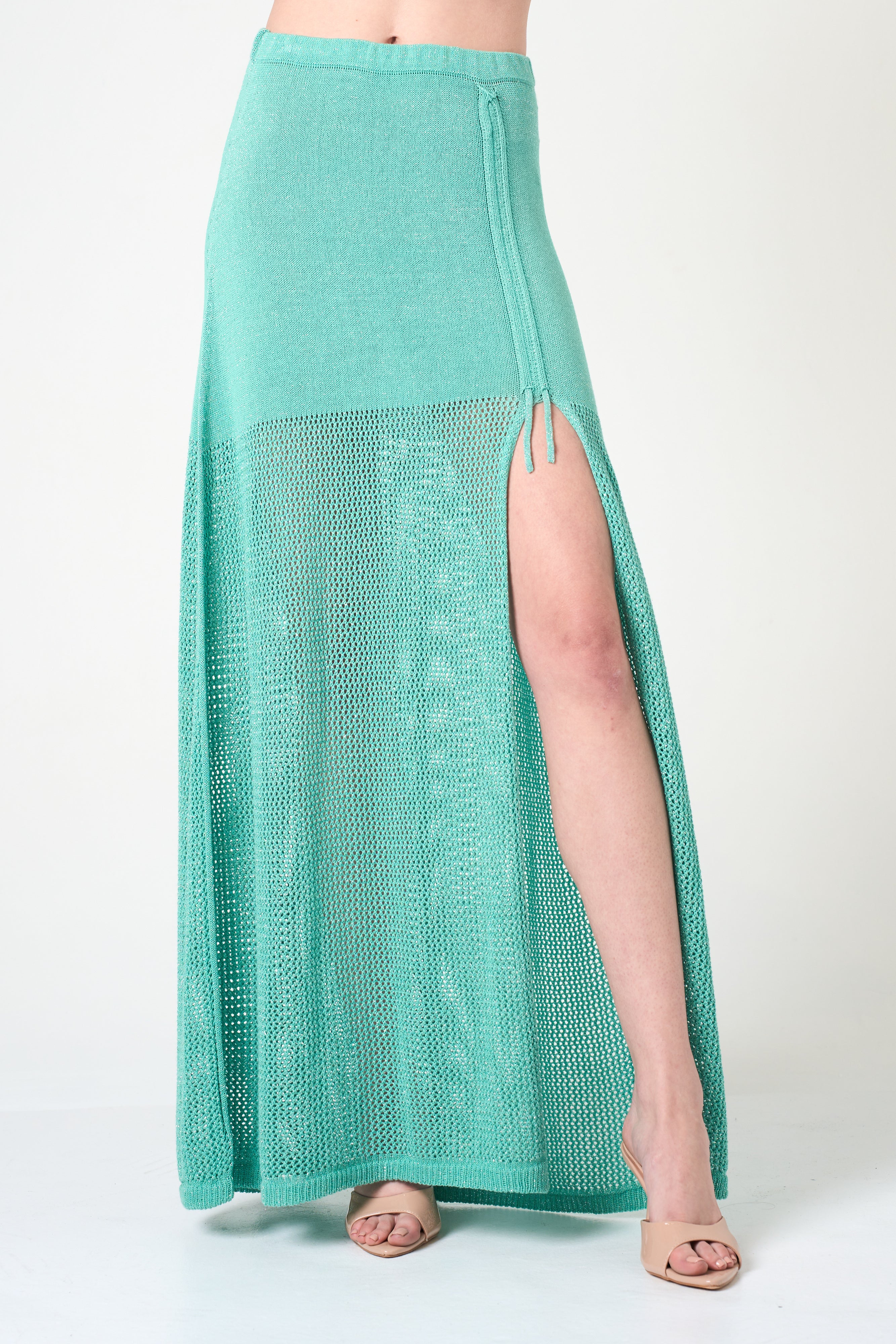 A true statement piece with an exceptionally smooth feel and comfortable band waist. Crafted in Italy, it features a unique textural contrast: a solid knit blending into our signature Perforato pattern. The adjustable front cord allows you to lift and drape the fabric for a personalized, versatile look. Finished with a hint of Lurex for refined glamour and consciously made with sustainable organic fibers.