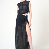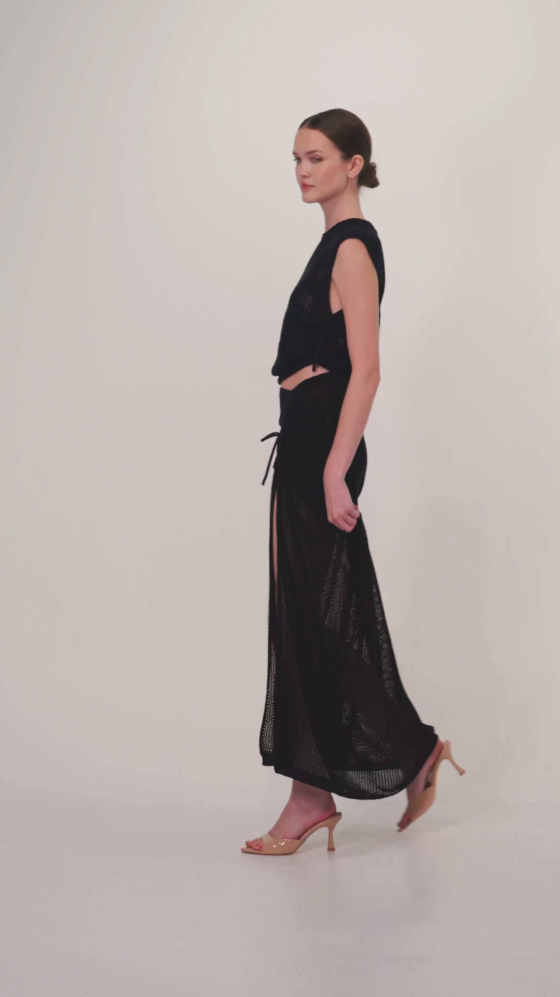 A true statement piece with an exceptionally smooth feel and comfortable band waist. Crafted in Italy, it features a unique textural contrast: a solid knit blending into our signature Perforato pattern. The adjustable front cord allows you to lift and drape the fabric for a personalized, versatile look. Finished with a hint of Lurex for refined glamour and consciously made with sustainable organic fibers.
