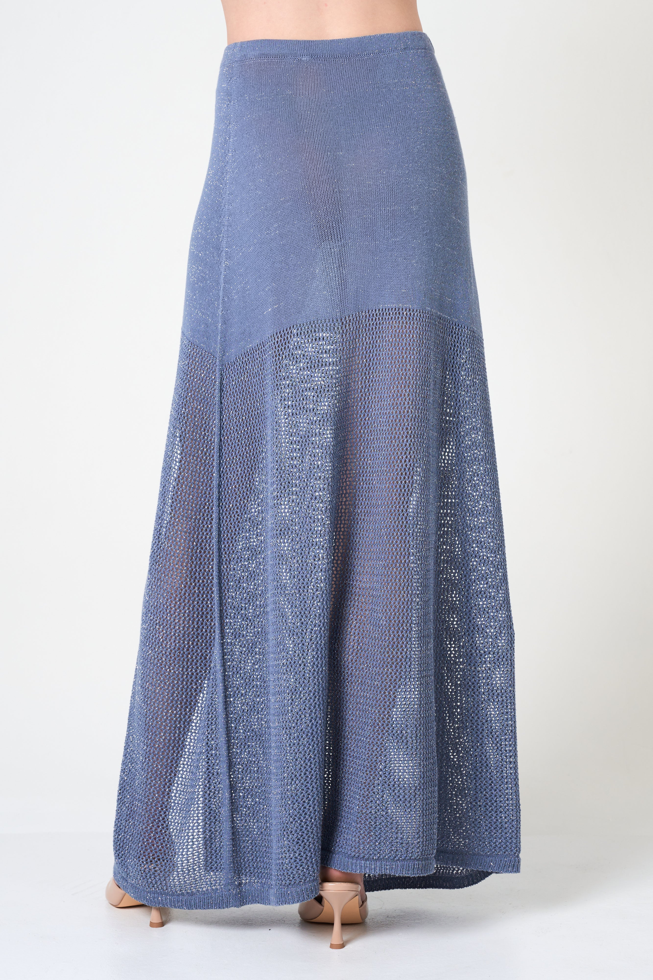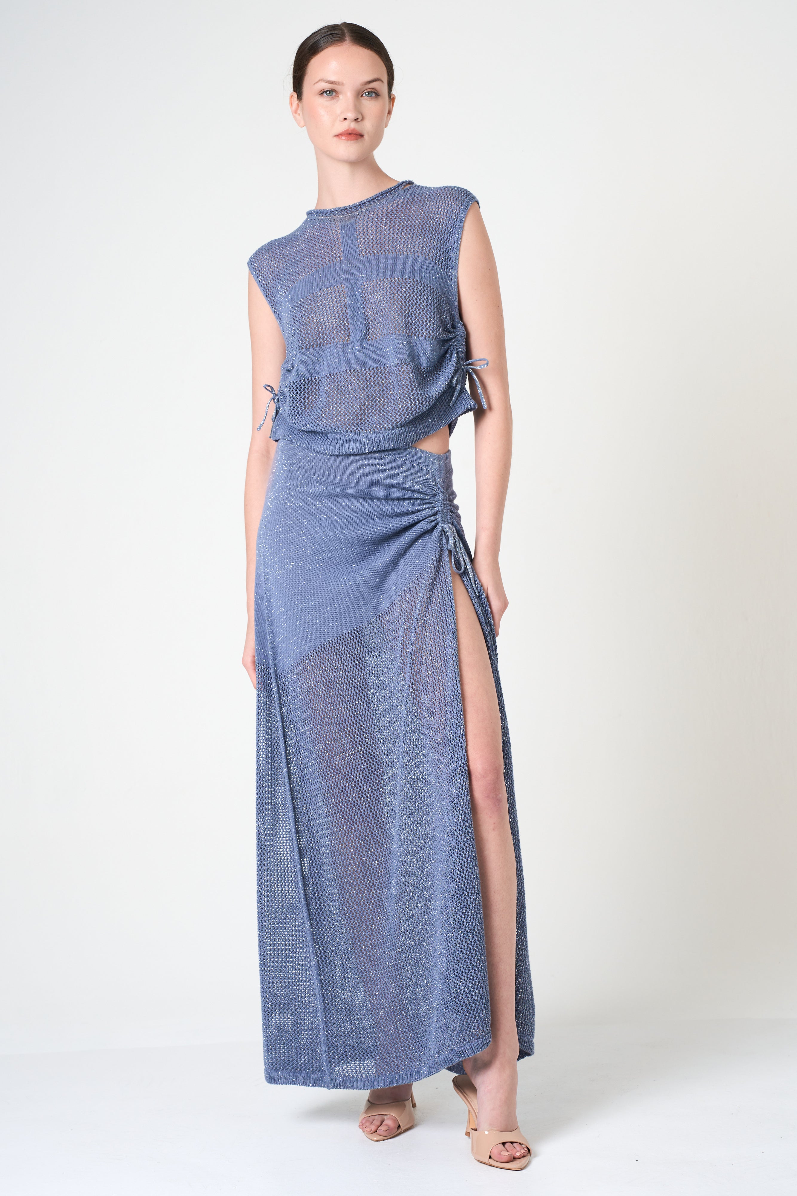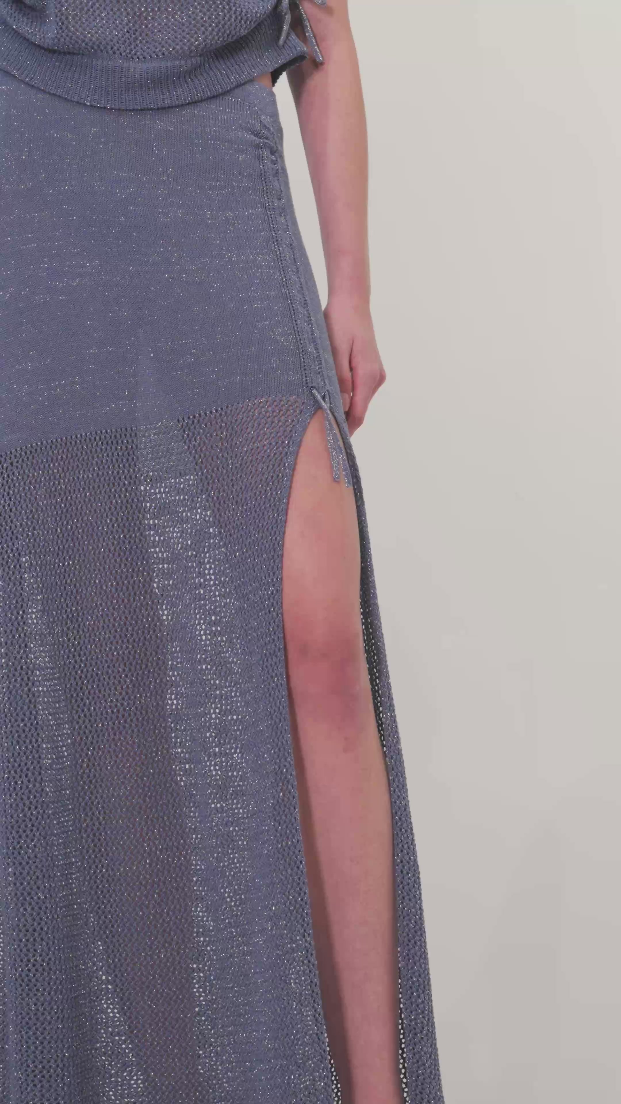 A true statement piece with an exceptionally smooth feel and comfortable band waist. Crafted in Italy, it features a unique textural contrast: a solid knit blending into our signature Perforato pattern. The adjustable front cord allows you to lift and drape the fabric for a personalized, versatile look. Finished with a hint of Lurex for refined glamour and consciously made with sustainable organic fibers.